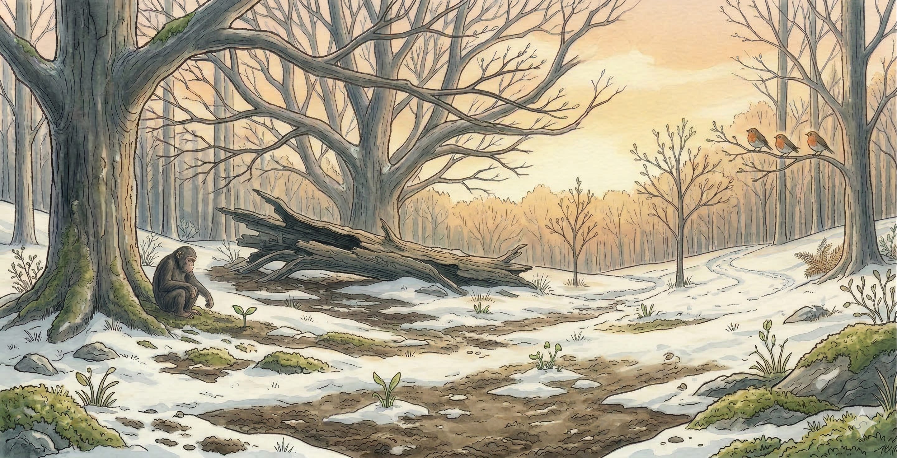 When the visible forest goes quiet — bare branches, no green, everything apparently stopped — the underground system stays active. Mycorrhizal fungi, the networks connecting tree roots, continue cycling nutrients through the cold months.³ Soil bacteria keep metabolizing below the frost line.⁴ Seeds sit in the frozen ground undergoing stratification — a process where cold exposure literally restructures their chemistry, breaking down germination inhibitors so they can sprout when conditions are right.⁵ Seeds that skip this step? Less resilient. Less likely to survive what comes next.